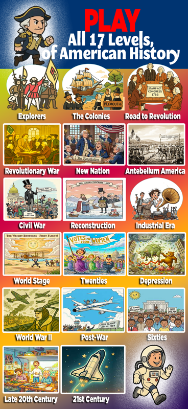 HISTORY RUN combines classic arcade “platformer” game mechanics with educational depth. The app opens with a fictional robbery at the Smithsonian: the museum has been robbed, and players must recover stolen artifacts from across American history. Players choose from historical character avatars and race through eras spanning early exploration to modern times. Each level features period-accurate visuals, timeline events, and a hidden artifact that must be recovered and returned to the player’s growing museum collection.