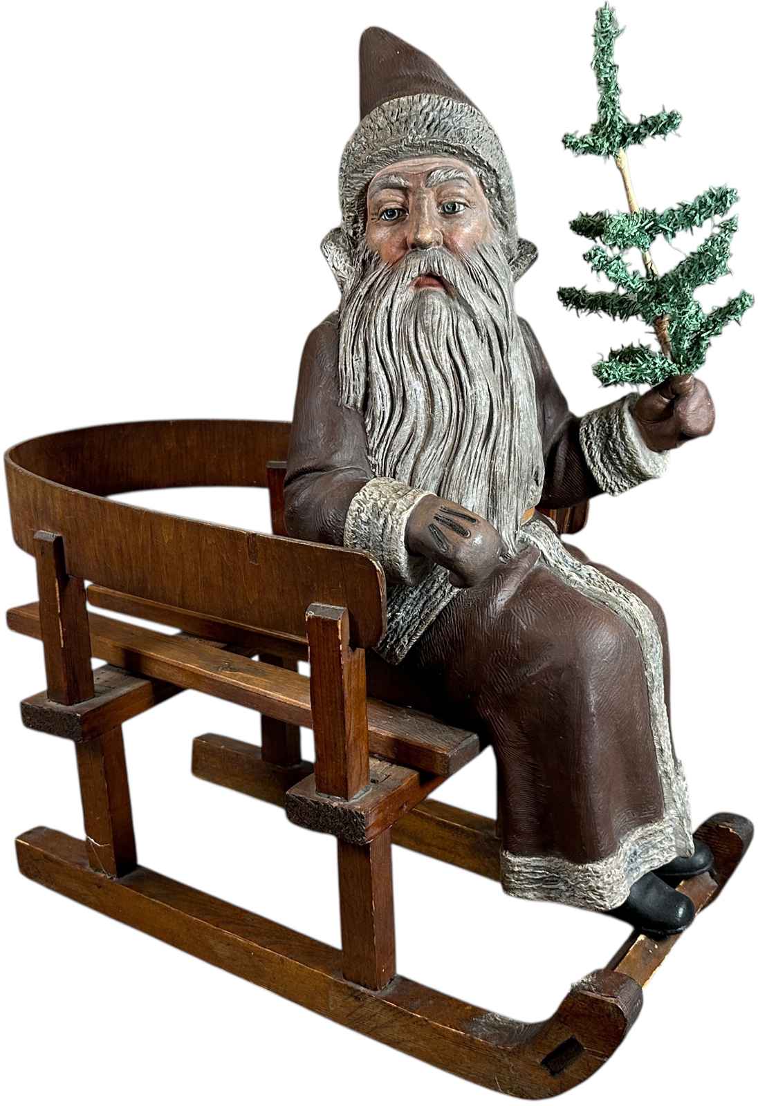 German terracotta Santa figure seated on wooden sleigh. Superb detail and realism of the strands of beard hair. Height: 22in. VG to Excellent condition overall with pristine Santa figure. Sold for $66,000