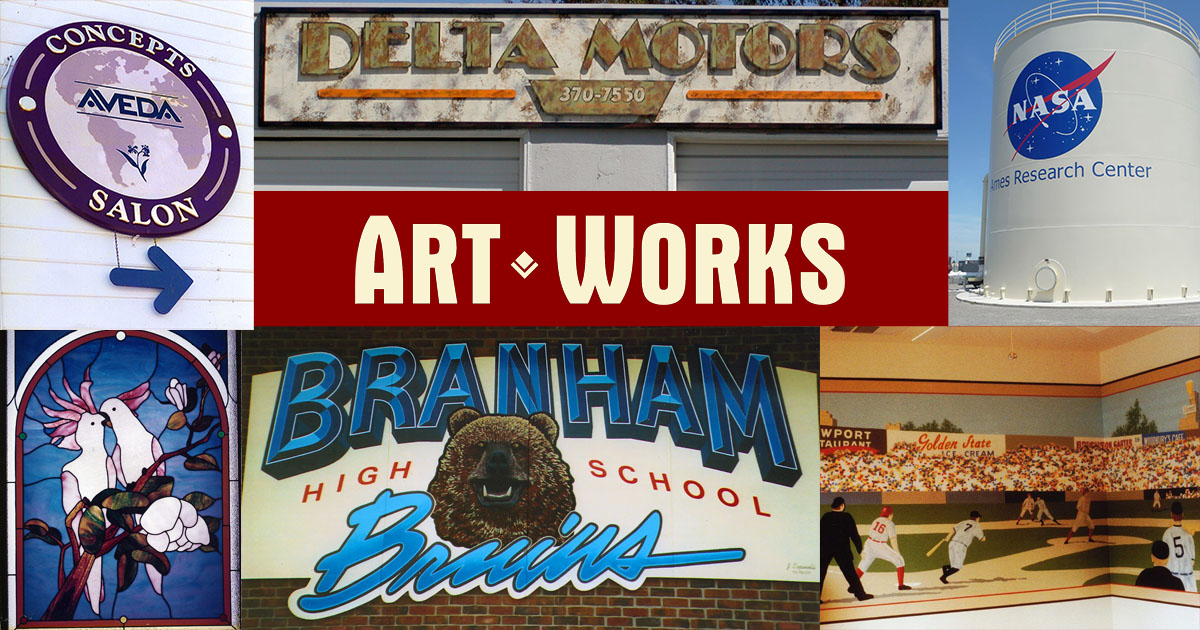 Art Works is a Campbell, California–based studio specializing in custom handcrafted signs, commercial signage, murals, school murals, stained glass, paintings, and boat lettering. Founded in 1980 by artist John Espinola, who holds a BFA in painting, Art Works has painted exterior and interior murals throughout Northern California's Silicon Valley and has created custom signage for countless local businesses, schools, and institutions. The professional, knowledgeable, and friendly team at Art Works loves tackling design challenges and fostering an open, collaborative environment that leads to thoughtful, beautiful results on every project. With over 40 years of proven craftsmanship, Art Works believes that handcrafted custom signage built to last is for businesses built to last.