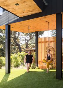 The jury also highlights the home’s architectural choreography: at the ground level, the family room opens to an outdoor yard beneath a floating bridge, with swings tucked under the home’s “nest wing”—a playful gesture that makes structure and circulation inseparable from daily life.