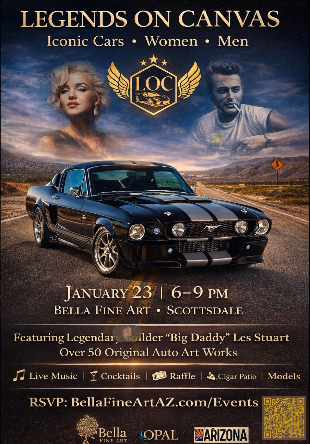 Hosted during Arizona Car Week, Legends on Canvas™ transforms Bella Fine Art into an immersive gallery exhibition featuring more than 50 original works of automotive fine art. The collection includes paintings and mixed-media works inspired by classic cars, performance legends, Hollywood icons, and automotive design history. Many of the works will debut publicly for the first time.