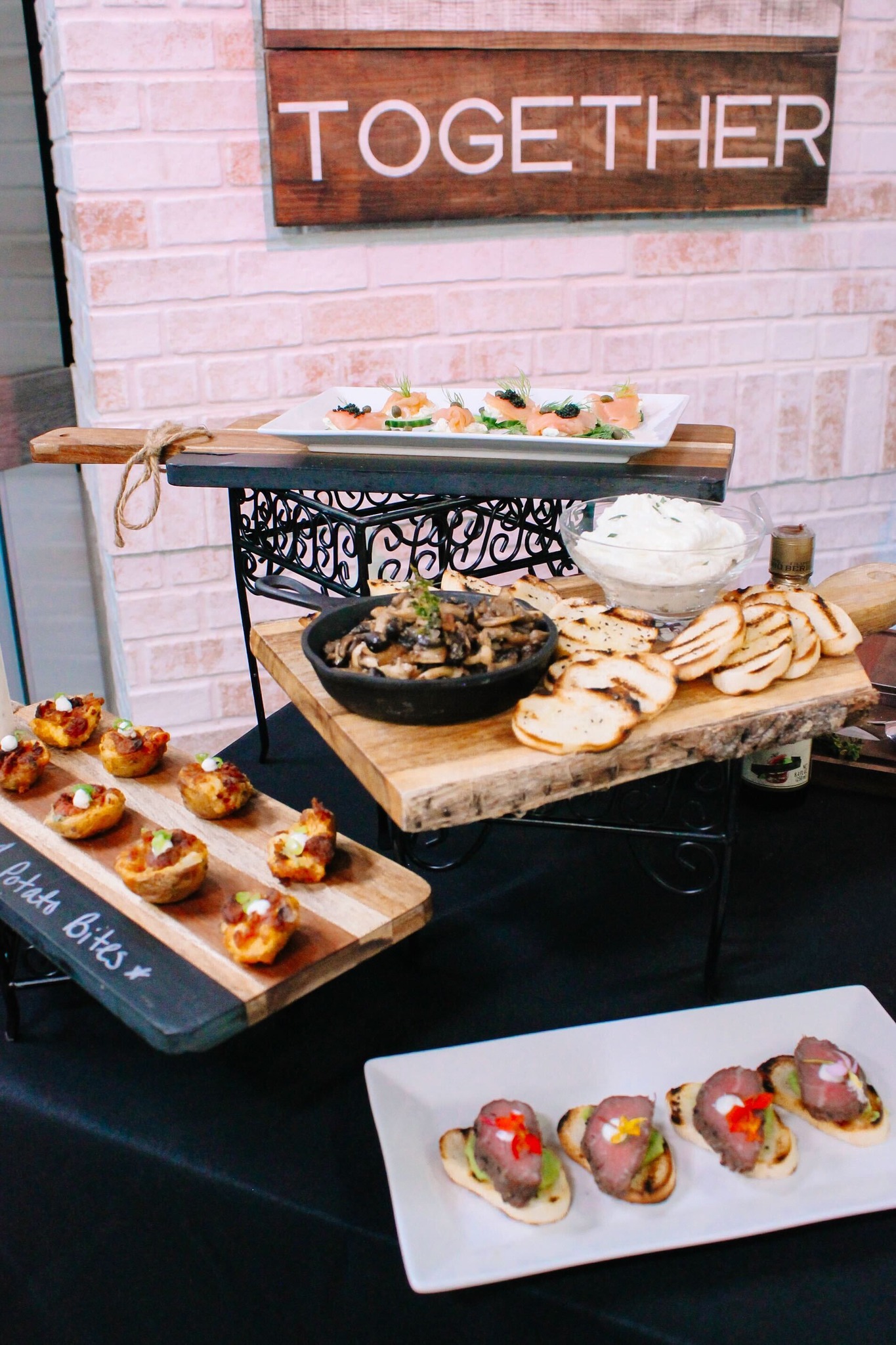 Chef Serge Krikorian's four winter party appetizers showcased on THV11's The Vine, including (clockwise from top) smoked salmon on cucumber rounds, sautéed mushroom crostini with whipped ricotta, peppered beef tenderloin crostini, and twice-baked potato b