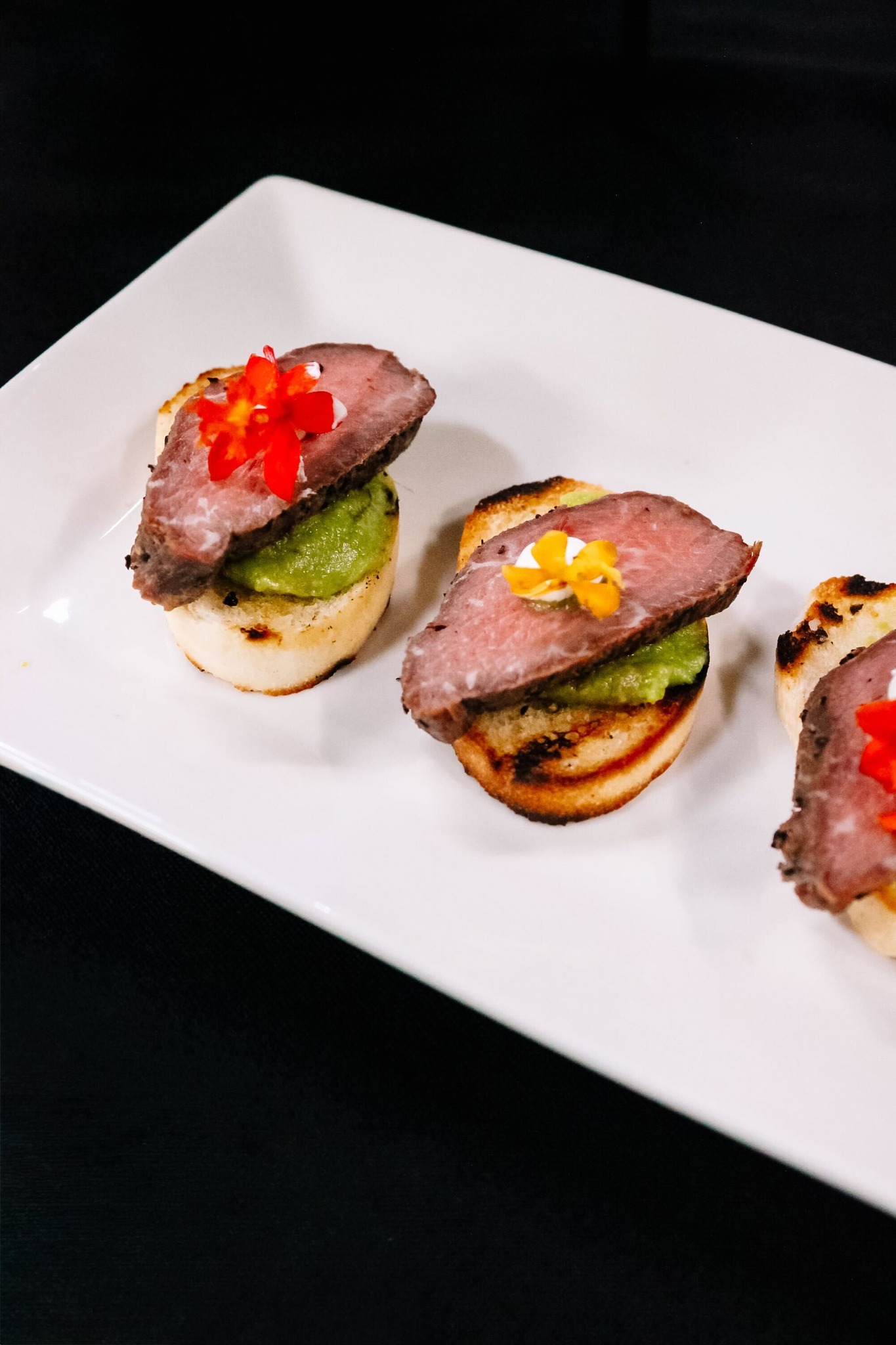 Peppered Beef Tenderloin Crostini – Perfectly cooked beef tenderloin served on grilled crostini with a vibrant chimichurri-style sauce and colorful pepper garnish