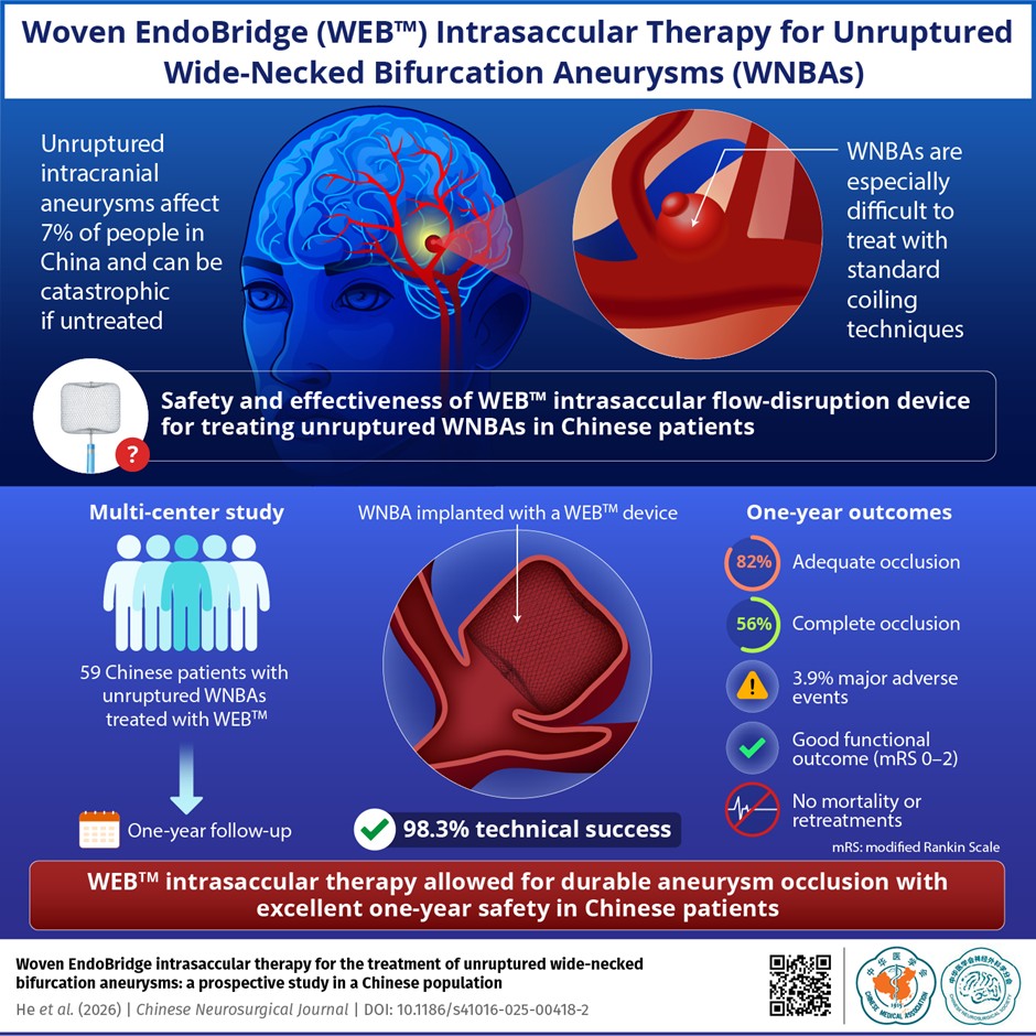 BEIJING, BEIJING, CHINA, March 12, 2026 /EINPresswire.com/ -- Brain aneurysms are balloon-like bulges in blood vessels that can rupture, causing life-threatening hemorrhages. Wide-necked bifurcation aneurysms (WNBAs), occurring at arterial branch points, are particularly challenging to treat due to their complex anatomy. Conventional coiling or stent-assisted techniques may require long-term blood-thinning therapy and carry risks of thromboembolism or vessel damage. Seeking safer, less invasive options, researchers investigated the Woven EndoBridge (WEB) intrasaccular device, designed to sit entirely inside the aneurysm, disrupt blood flow, and promote clot formation without extending into the parent artery.A research team led by Professor Hongqi Zhang from the Department of Neurosurgery at Xuanwu Hospital, Capital Medical University, Beijing, China and Professor Jianmin Liu from Neurovascular Center, Naval Medical University, Changhai Hospital, Shanghai, China, conducted a prospective multicenter observational study across eight Chinese hospitals between June 2017 and August 2019. The study enrolled 60 adult patients with unruptured WNBAs suitable for WEB implantation. Each patient underwent standardized imaging, procedural planning, and follow-up at 30 days, 6 months, and 1 year. The study was published in Volume 12 of the Chinese Neurosurgical Journal on January 20, 2026.