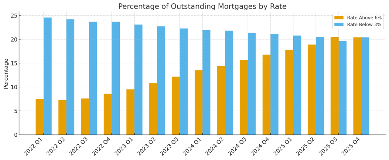 Current data suggests a more nuanced market environment than many headlines imply. One notable shift is occurring within the composition of outstanding mortgages in the United States. For the first time since the pandemic, the number of mortgages with interest rates above 6 percent is roughly equal to the number below 3 percent. This shift indicates a gradual easing of the so-called “lock-in effect,” which has limited housing inventory and homeowner mobility.