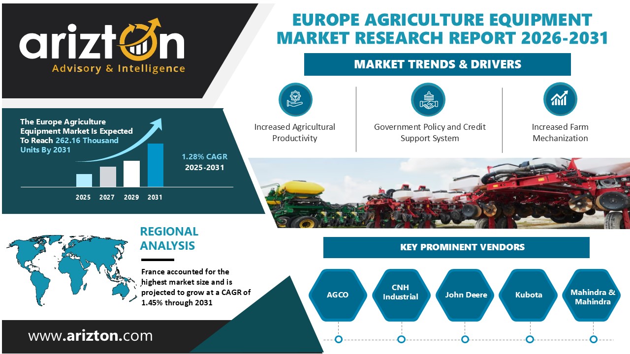 CHICAGO, IL, UNITED STATES, January 22, 2026 /EINPresswire.com/ -- According to Arizton research, the Europe agriculture equipment market size was estimated at 242.96 thousand units in 2025 and is expected to reach 262.16 thousand units by 2031, growing at a CAGR of 1.28% during the forecast period. The market is a vital and rapidly evolving segment of the agricultural industry, influenced by a mix of structural farm trends, regulatory frameworks, technological innovations, and changing demand patterns. Europe holds a significant share of the global agricultural equipment market, bolstered by extensive arable land and a strong tradition of mechanized farming. The demand for tractors, combine harvesters, balers, seed drills, and crop protection equipment remains robust, driven by the need to improve productivity, enhance operational efficiency, and manage rising labour costs.