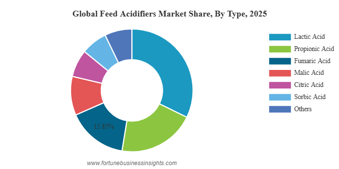 • By Type, lactic acid held the largest share in 2025 due to its effective antimicrobial properties and benefits in nutrient digestibility.