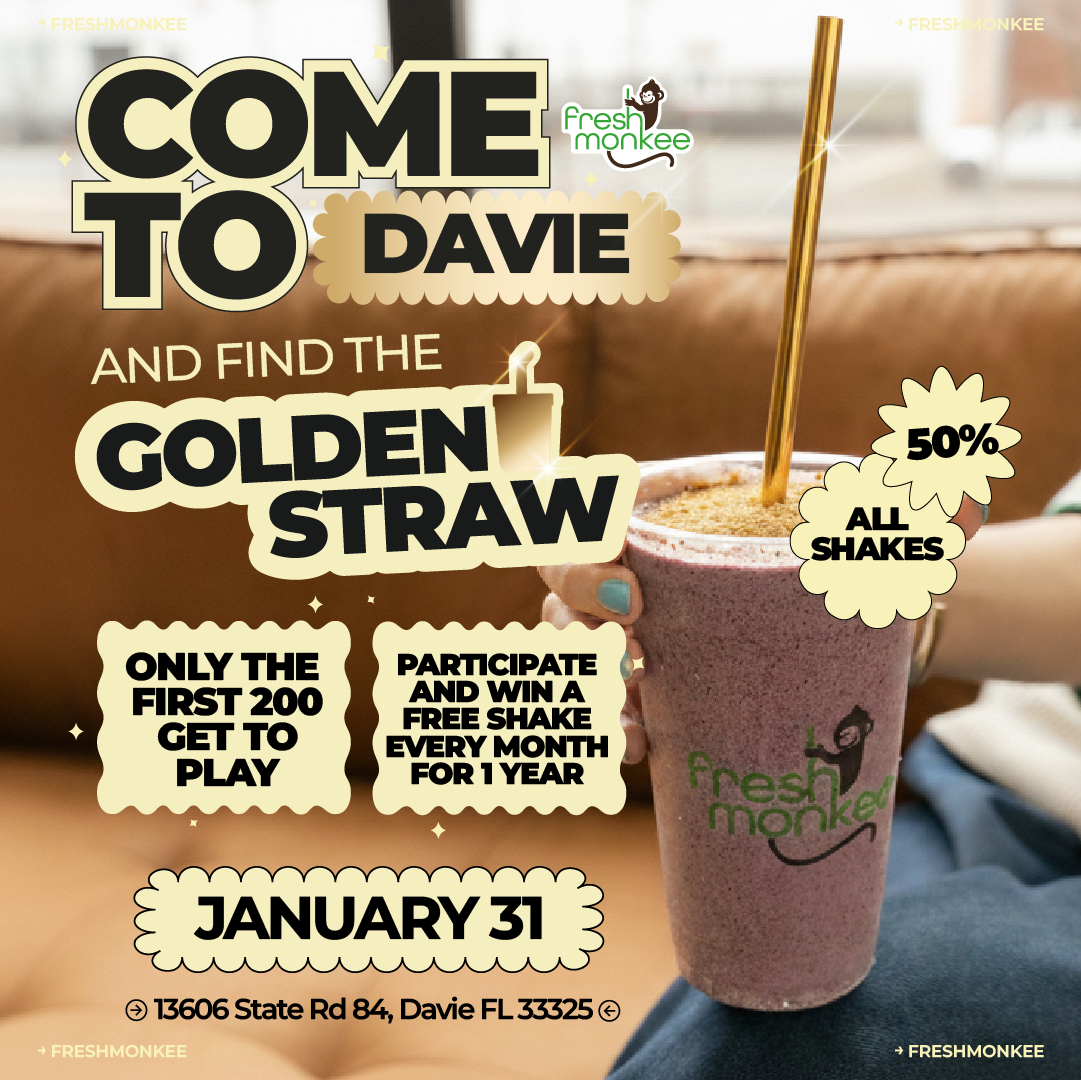 Now open in Davie, Ponte Vedra, Palm Harbor, and Wesley Chapel. Be one of the first 200 and find the Golden Straw and win free shakes for a year.