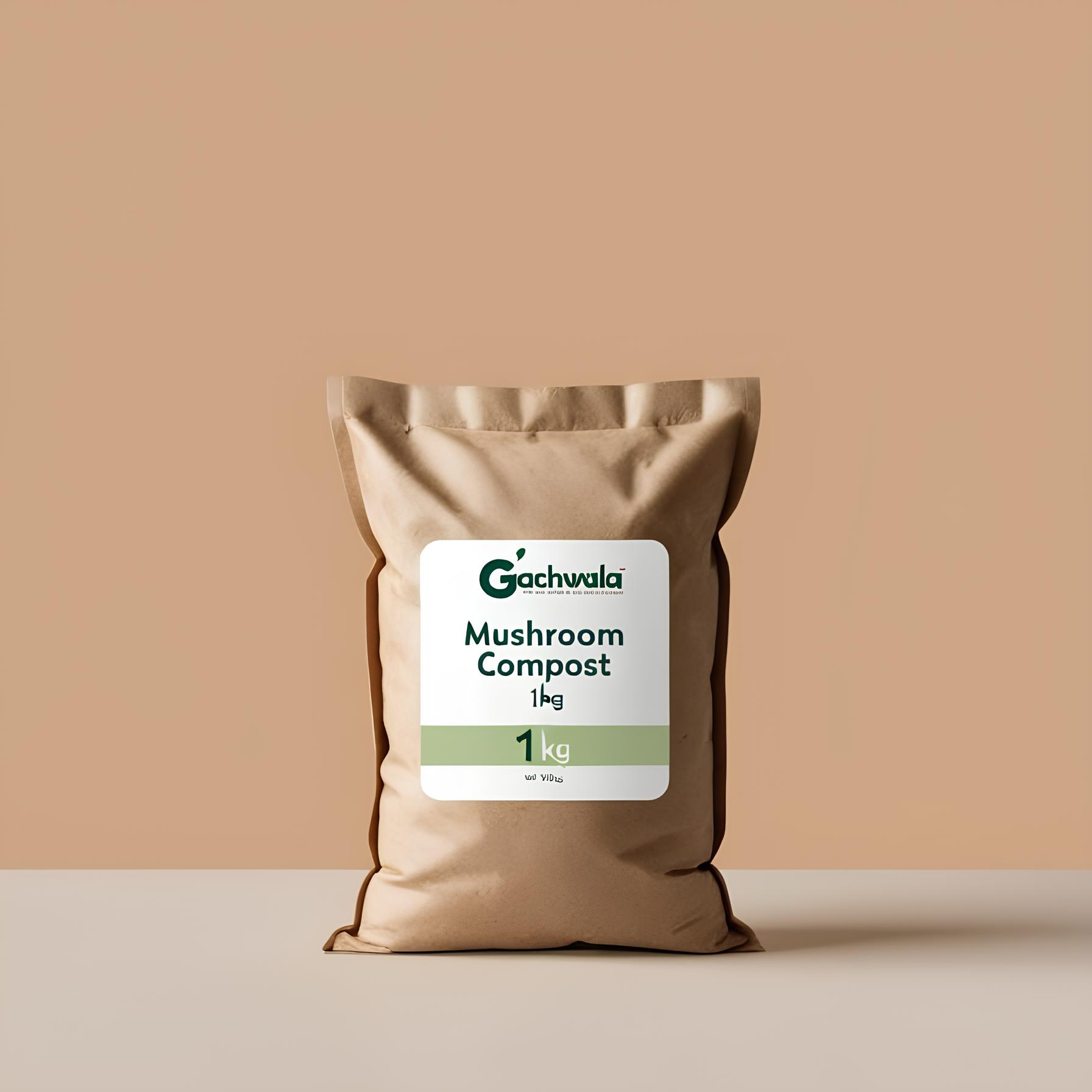 Packaged presentation of Gachwala mushroom compost supplied in a 1 kg pack for use in mushroom cultivation and growing setups.