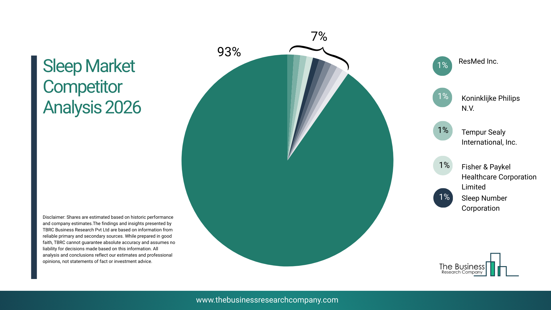 The market is fragmented, with the top 10 players accounting for 6% of total market revenue in 2024. This level of fragmentation reflects the diffuse and competitive nature of the industry, characterized by low-to-moderate entry barriers across certain product categories, evolving consumer preferences, and strong participation from regional and niche brands. Leading companies such as ResMed Inc., Koninklijke Philips N.V., Tempur Sealy International, Inc., Fisher & Paykel Healthcare Corporation Limited, and Sleep Number Corporation maintain competitive advantages through strong brand recognition, diversified portfolios spanning sleep therapy devices, diagnostics, mattresses, and smart sleep technologies, as well as continuous product innovation. However, each holds only a modest share of the overall market, underscoring significant opportunities for expansion, strategic partnerships, and consolidation as global awareness of sleep health and demand for technologically advanced sleep solutions continue to rise.