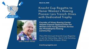 CHERRY HILL, NJ, UNITED STATES, March 11, 2026 /EINPresswire.com/ -- The 27th Annual Knecht Cup Regatta, set for Saturday, April 11 and Sunday, April 12 on the Cooper River, will honor one of the Philadelphia region’s most influential champions of rowing by dedicating the Women’s Varsity Quad race trophy in the name of Lois Trench-Hines, a pioneer for women’s rowing and a lifelong advocate for expanding access to the sport.— Laura Knecht Blanche, Regatta Director of the Knecht Cup Regatta