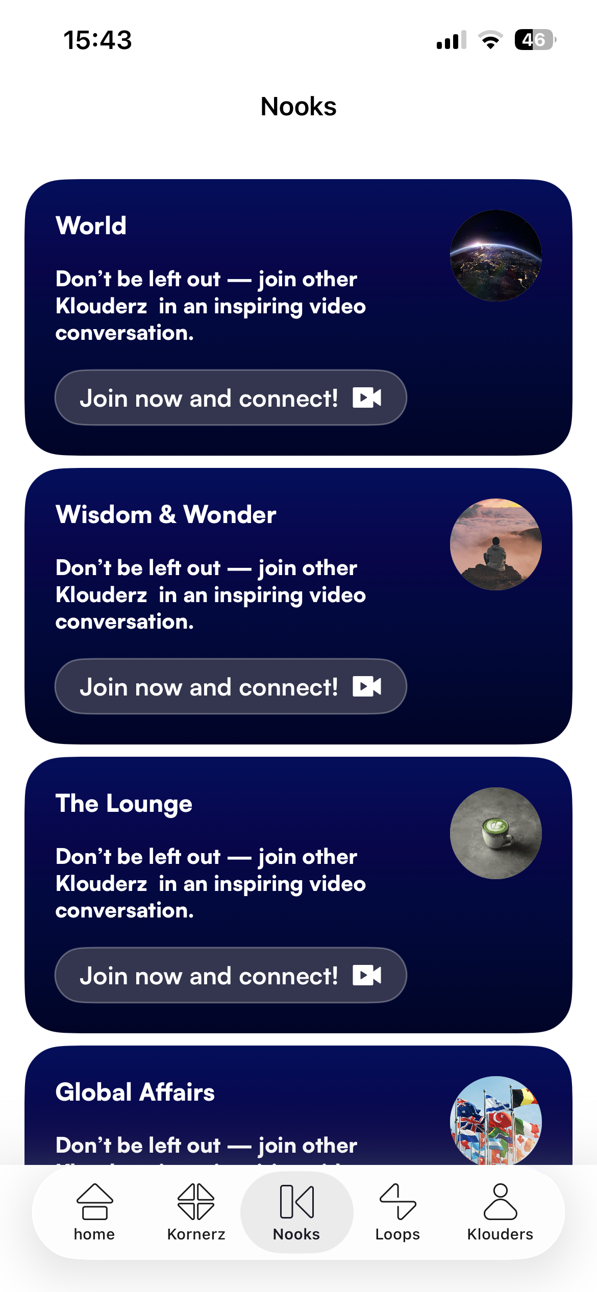 come to Kornerz, end up staying in the app, getting involved in the many meeting rooms