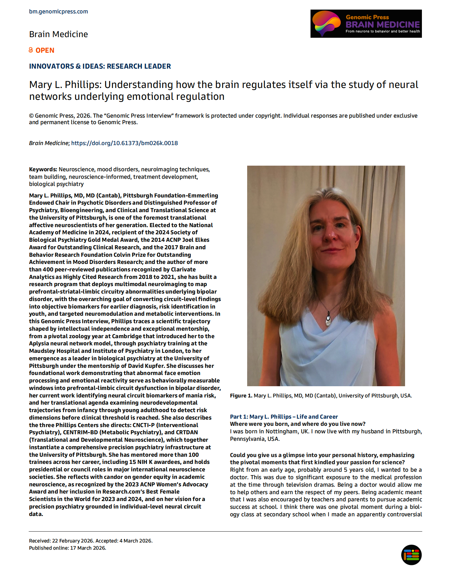The Genomic Press Interview in Brain Medicine titled "Mary L. Phillips: Understanding how the brain regulates itself via the study of neural networks underlying emotional regulation," is freely available via Open Access, starting on 17 March 2026 in Brain Medicine at the following hyperlink: https://doi.org/10.61373/bm026k.0018.