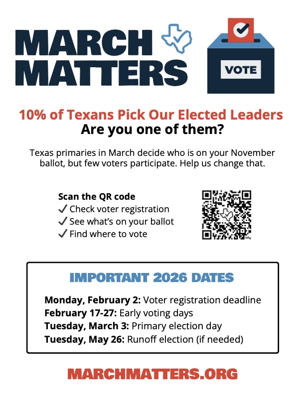 AUSTIN, TX, UNITED STATES, January 20, 2026 /EINPresswire.com/ -- With just six weeks until the March 3 primary election, a new statewide effort is working to help more Texans take part in the election that decides most state leadership races. March Matters has launched a nonpartisan communications campaign offering free, ready-to-use tools for businesses, nonprofits, chambers, faith organizations, and community groups to encourage voter participation.— Marjorie Clifton