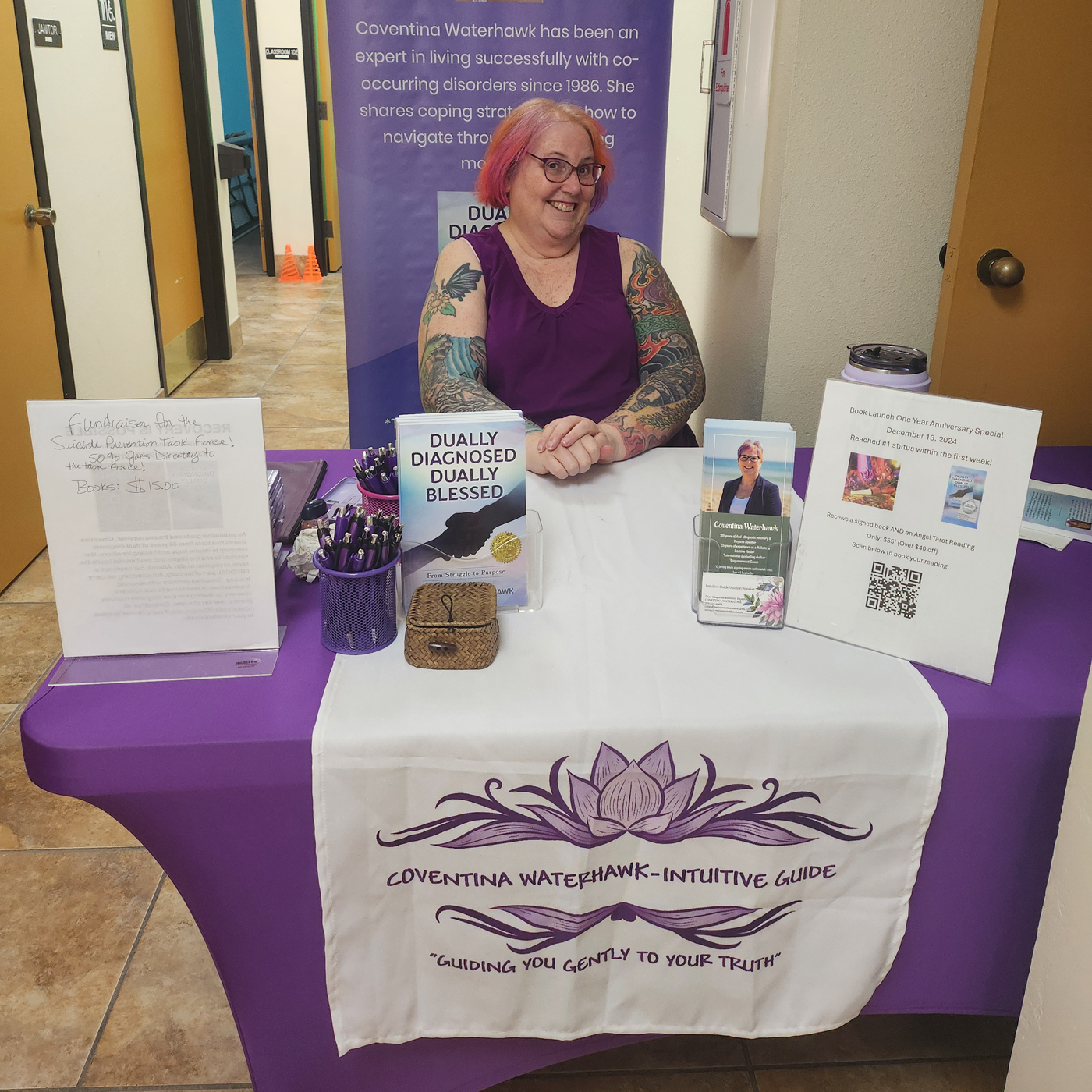 Coventina currently partners with her local Suicide Prevention Task Force, co-hosting fundraising book signings to spread the message of hope to those who need it most. Her book also serves as a workbook for an IOP (Intensive Outpatient Program), where she teaches holistic coping methods to patients.