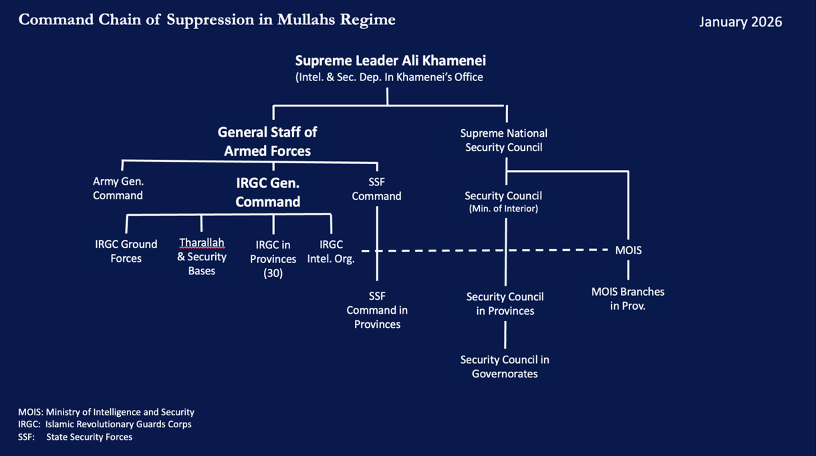 The ‘Command Chain of Suppression in the Mullahs’ Regime’ graphic presented at the NCRI-US press briefing to expose the Iranian regime’s premeditated plan behind the massacre of the January 2026 uprisings. February 3, 2026. (NCRI-US Photo)