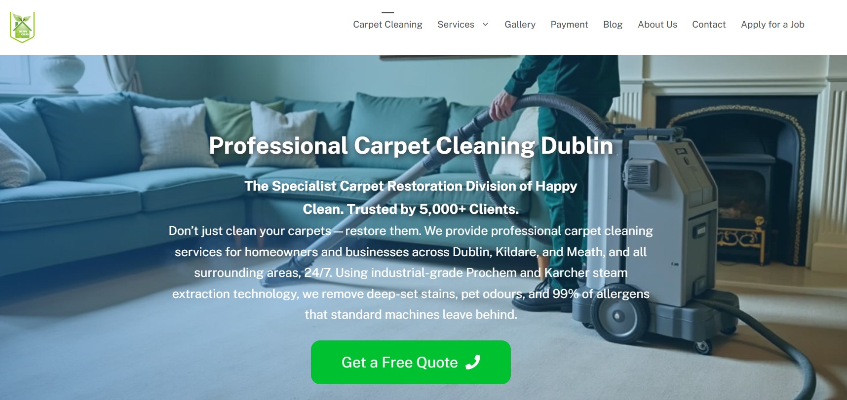 Happy Clean is a Dublin-based cleaning company providing PREMIUM & Luxury carpet cleaning, upholstery cleaning, mattress cleaning, leather cleaning, floor cleaning, power washing, house cleaning, car valet and window cleaning services to domestic and commercial customers, at standard pricing. The company operates across Dublin and neighbouring counties, serving homeowners, tenants, landlords, estate agents and businesses.