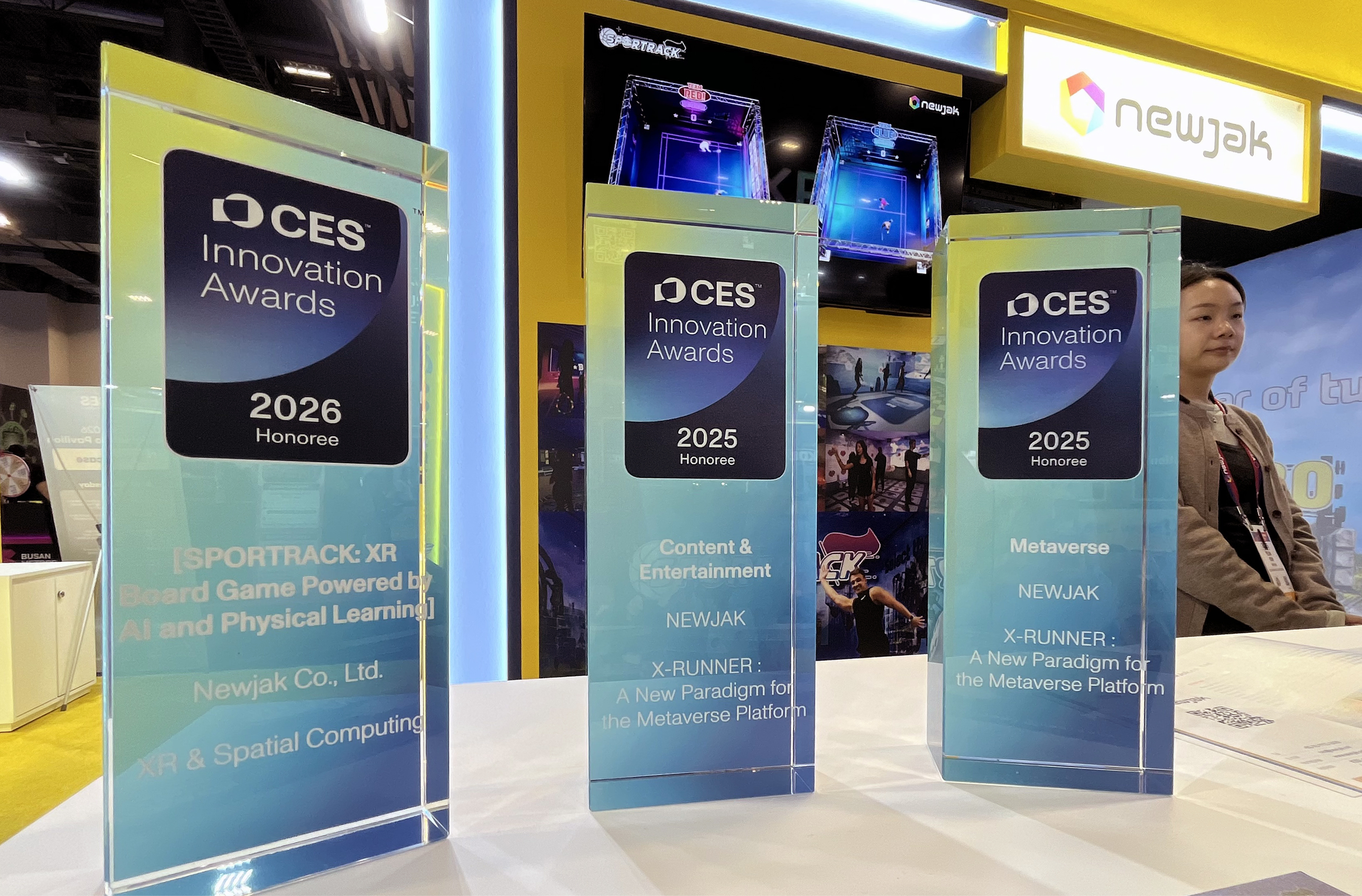 Trophies from CES Innovation Awards 2025 and 2026 are displayed side by side at NEWJAK’s booth. The company has been recognized for innovation across XR & Spatial Computing, Content & Entertainment, and Metaverse categories.