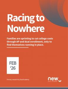 The school's model is informed by the Racing to Nowhere report, original survey research of 853 college-aspiring students and parents across 45 states published in February 2026. The research found that 89% of families are working to reduce the cost of a bachelor's degree and 60% want to shorten the time it takes -- yet 77% report hitting significant barriers with AP and dual enrollment: poor advising, scheduling conflicts, and deep uncertainty about whether credits will transfer. Only 23% navigated advanced coursework without major friction. The diagnosis is clear: the existing system was never designed to deliver on what families are trying to achieve.
