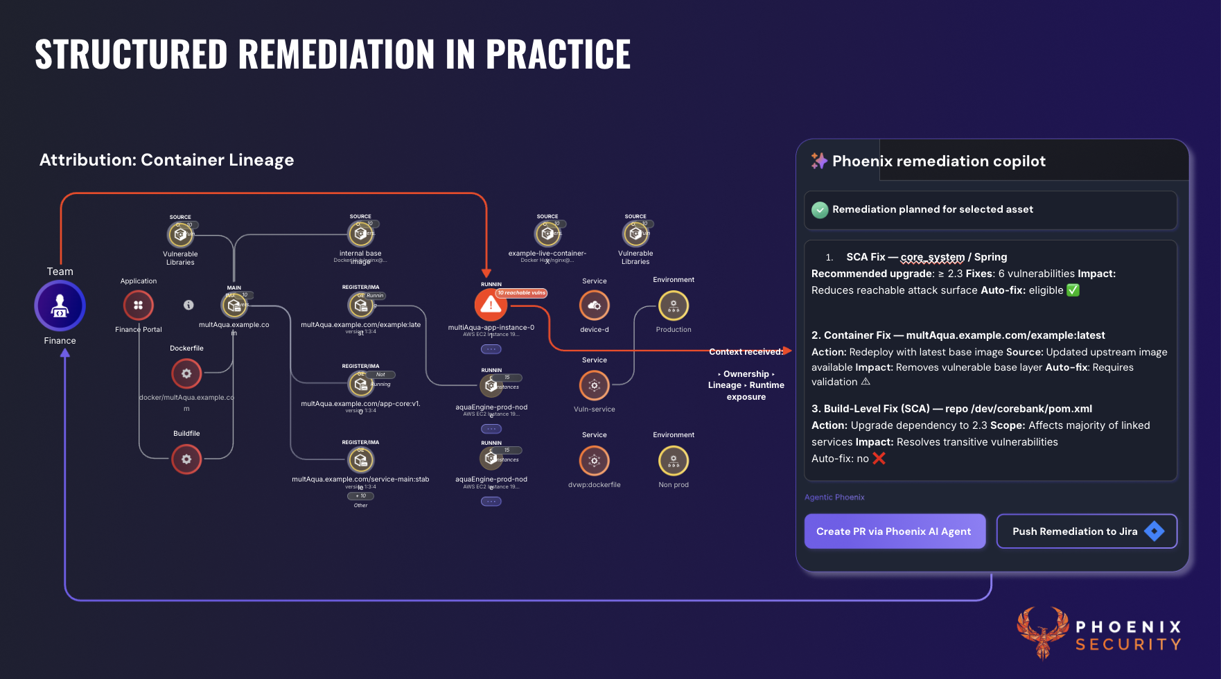 Phoenix Security's Remediation Engine changes the calculus. Before a single fix is proposed, the platform traces each vulnerability through a full lineage graph: from the running container, back through the registry image, to the base image or build file where the issue originates. Only then does the platform generate a remedy — the minimum version increment that closes the most findings, mapped to the correct file, owned by the correct team.