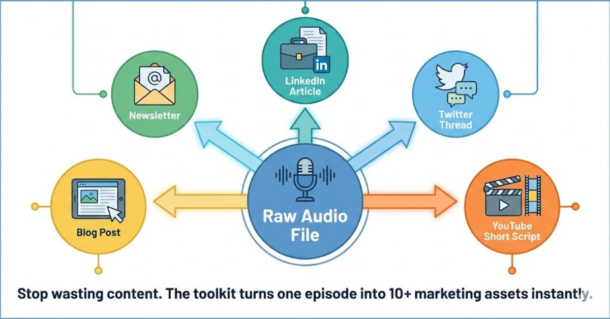 This release targets the "Solopreneur/Creator" segment, specifically addressing the critical bottleneck where recording ends and the tedious work of editing, writing, and promoting begins. By leveraging the "4-Hour Podcast Production" methodology, the toolkit shifts the podcaster's role from manual editor to strategic executive.