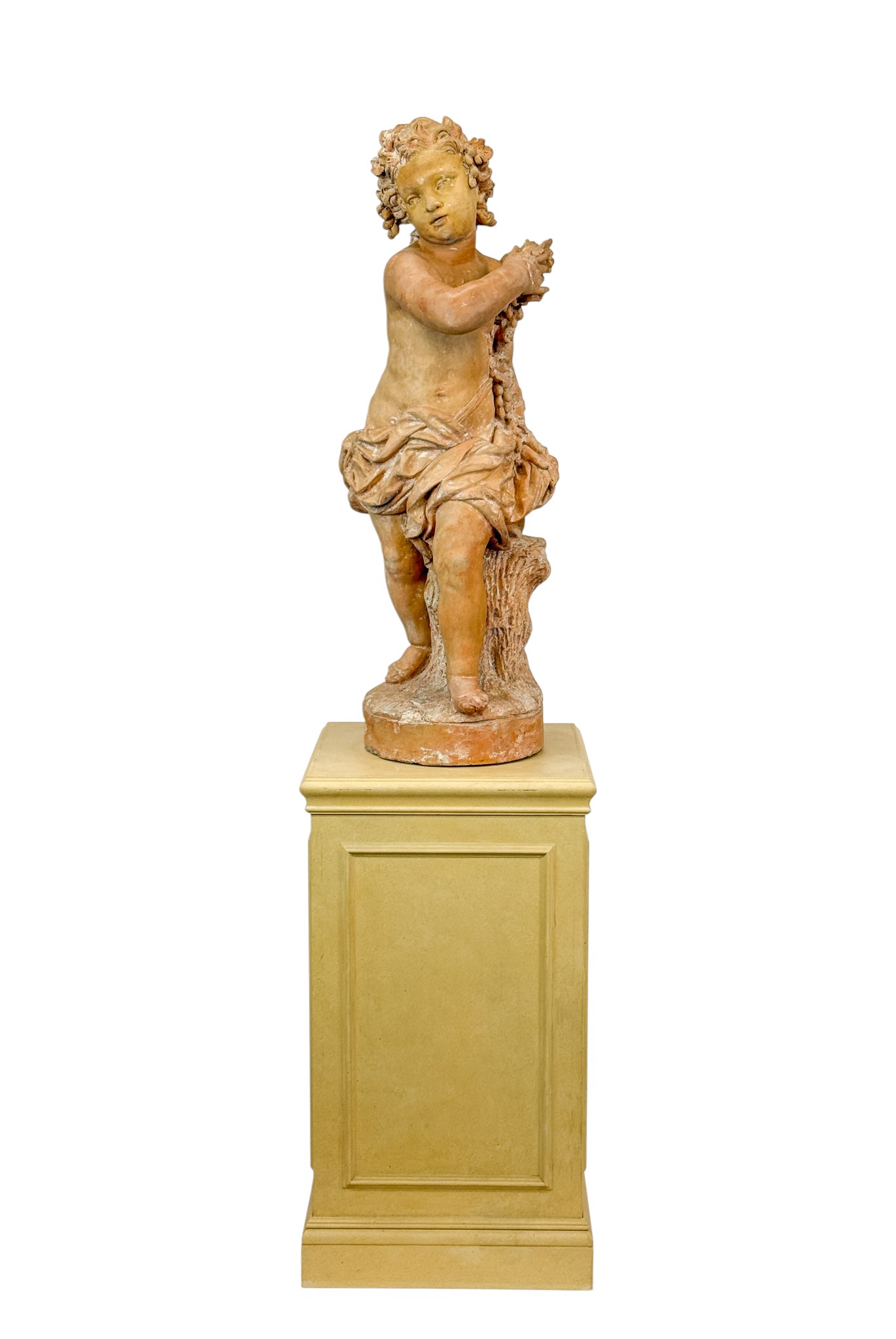 Mid-18th-century terracotta sculpture titled ‘Winter (One of the Four Seasons),’ 43 inches tall on a 34½-inch stand, depicting a child personifying Winter, clutching a bundle of sticks. Estimate: $10,000-$15,000