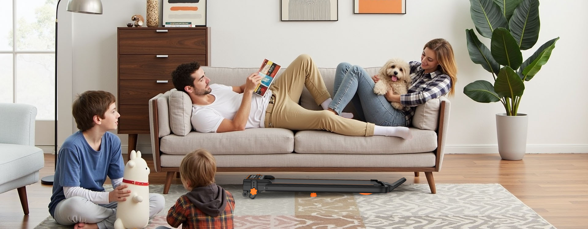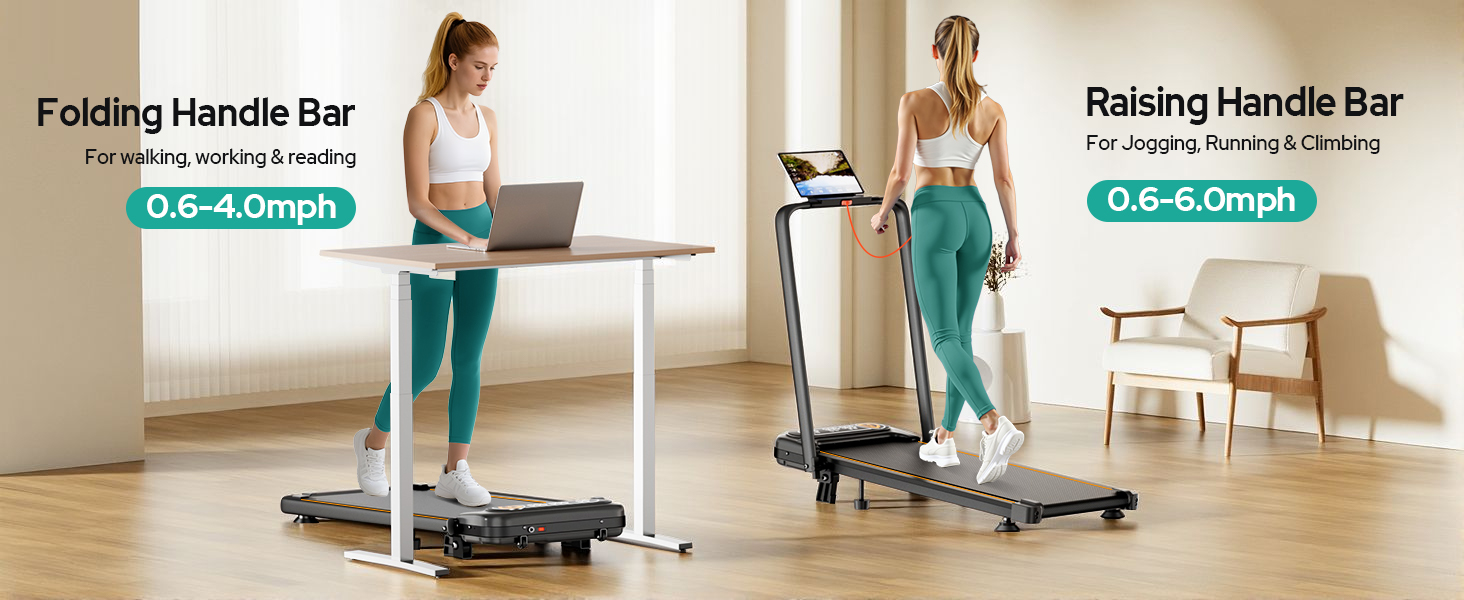 The 4-in-1 multifunctional design allows the treadmill to seamlessly transition between a walking pad, folding treadmill, under-desk treadmill, and hill climber. Users can walk or jog at speeds of 0.6–4 MPH with the handle folded, or raise it for running and incline training at speeds up to 6 MPH, making it adaptable for multiple users within the same household.