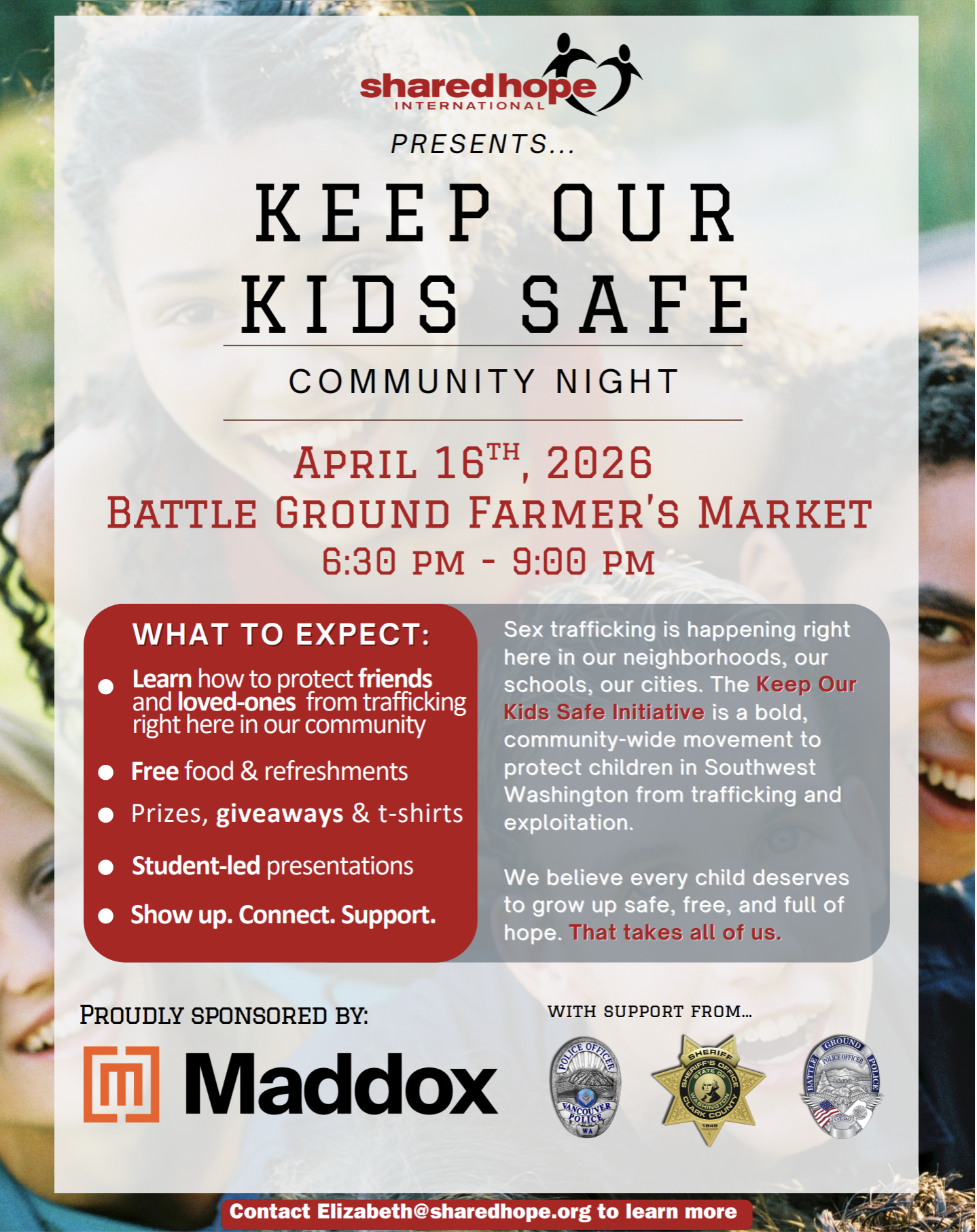 On Thursday, April 16, 2026, Shared Hope International is bringing the community’s response back to Battle Ground: a FREE Youth-Led Community Awareness Night at the Battle Ground Farmers Market, where young leaders will stand up in front of their neighbors, parents, and peers and teach them how to fight back. Admission is free. Prizes will be given away. Register now at sharedhope.org/community-26.