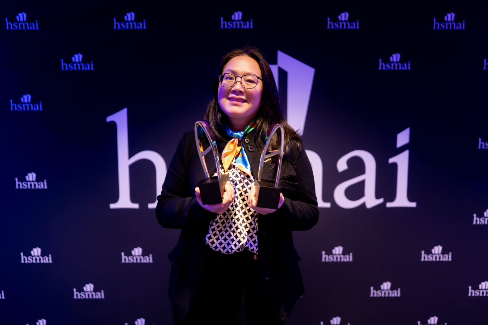 Director Vivian Lin of the Tourism Division, Taipei Economic and Cultural Office in Los Angeles, poses with the Gold and Silver awards in front of the backdrop at the HSMAI Adrian Awards Ceremony (February 18, 2026)