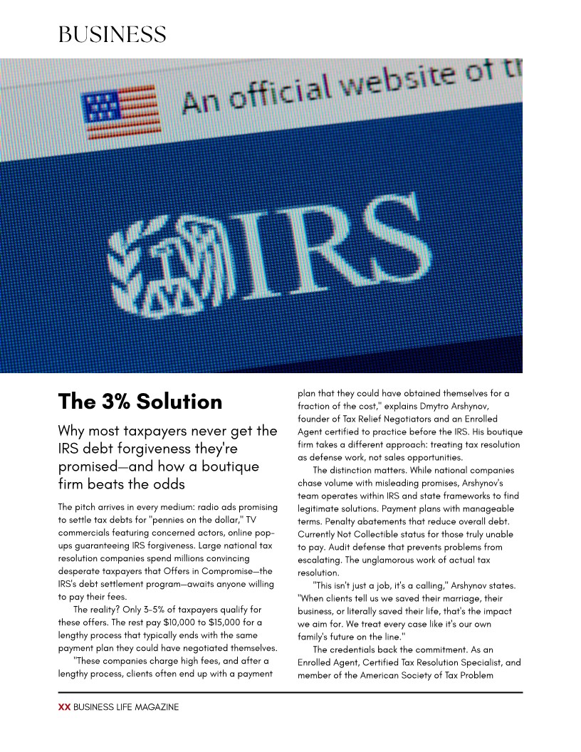 NEW YORK, NY, UNITED STATES, February 6, 2026 /EINPresswire.com/ -- Tax Relief Negotiators (TRN) was featured in the September/October 2025 edition of Business Life Magazine, a national business publication, for its compliance-focused and ethical approach to tax problem resolution.— Dmytro Arshynov, Founder, Tax Relief Negotiators
