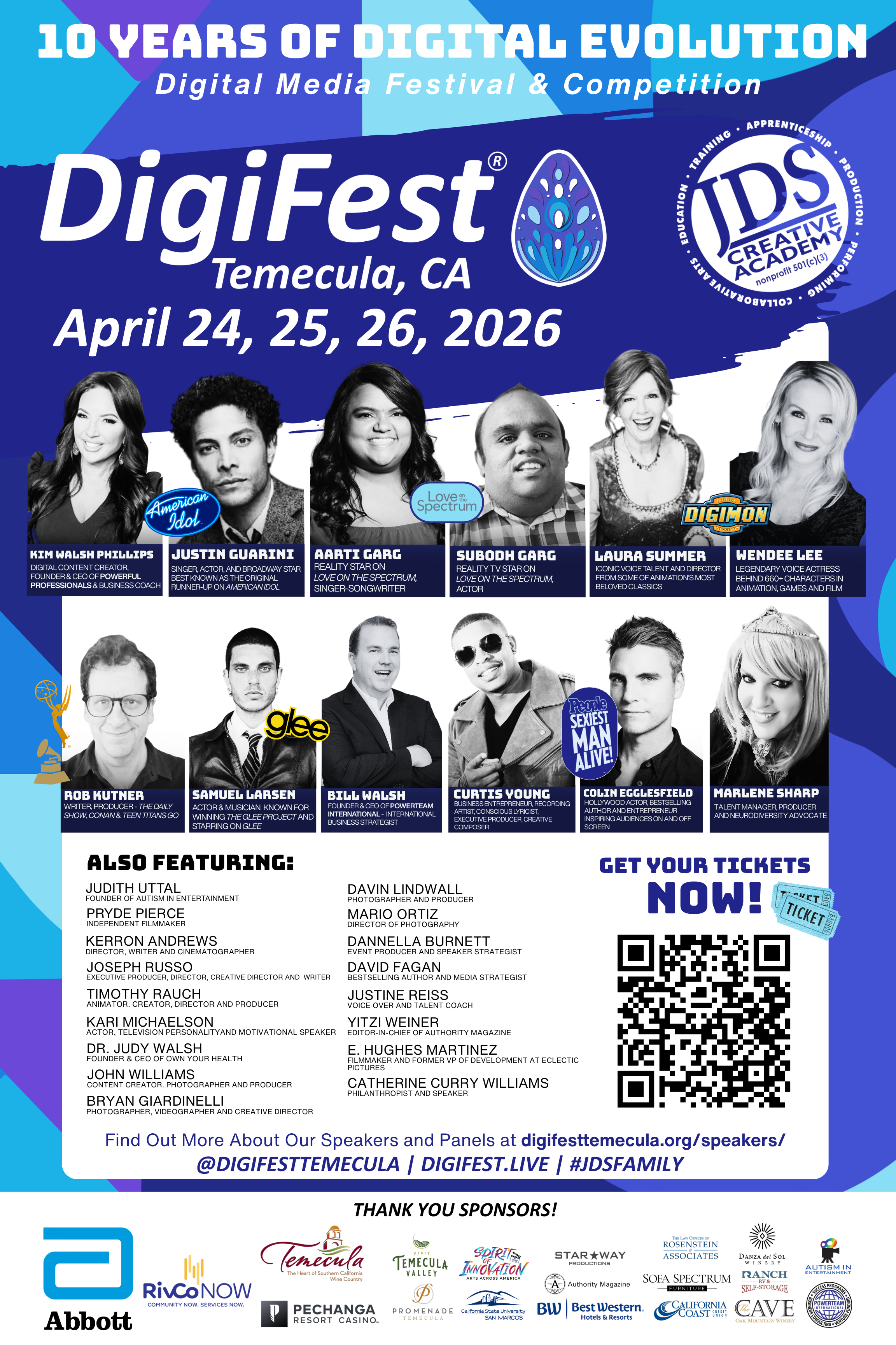 About DigiFest®: JDS Creative Academy, a 501(c)(3) nonprofit dedicated to advancing education, inclusion, and workforce development through the arts, created DigiFest® Temecula now it’s 10th year, since its inception in 2017, DigiFest® Temecula has grown into a vibrant, inclusive festival that brings together students, emerging talent, and professionals from around the world. The festival celebrates all forms of digital media and the creative arts—where ideas meet innovation and imagination turns into opportunity.