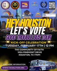 At the center of the Harris and Fort Bend County mobilization is the nationally recognized John Lewis “Make Good Trouble Vote! Bus.” The bus will lead “Votercades” across Houston and will feature music, clergy engagement, rides to the polls, and voter assistance in communities that have faced voter barriers ahead of the March 3, 2026, Primary Election. Named for civil rights icon John Lewis, the Votercades draw public awareness to the fact that election season has begun.