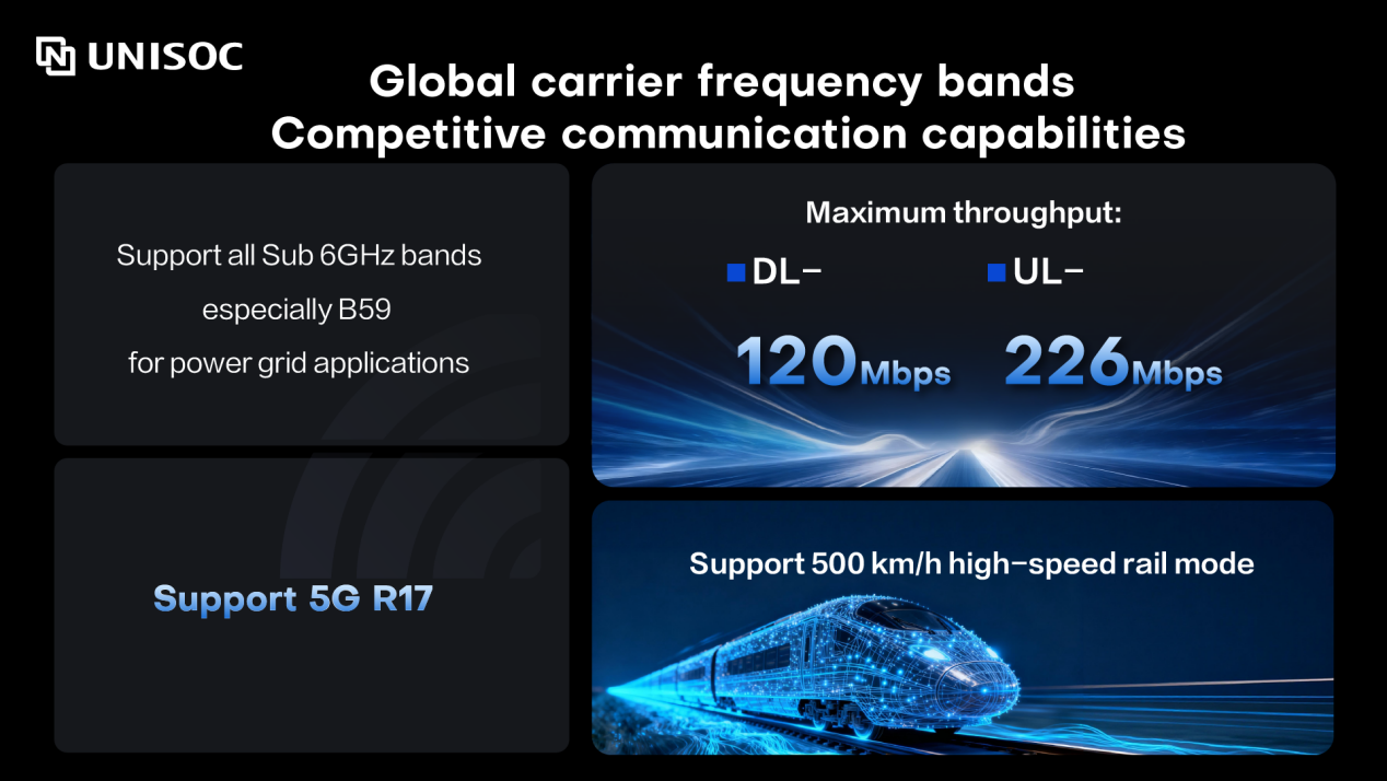 UNISOC V527 offers a maximum downlink speed of 226 Mbps and a maximum uplink speed of 120 Mbps, meeting the robust uplink capacity demands of industry scenarios such as mobile video capture, real-time monitoring, unmanned device communication, and industrial sensing. The V527 also supports mobility up to 500 km/h, enabling its deployment in rail transit, smart logistics, and high-speed mobile terminals. Regarding coverage capabilities, the V527 achieves ultra-long-range communication spanning 100 kilometers through SUL, channel repetition, and multi-slot enhancement. This ensures stable 5G connectivity even in challenging environments like remote mining areas, power lines, and telemetry equipment.