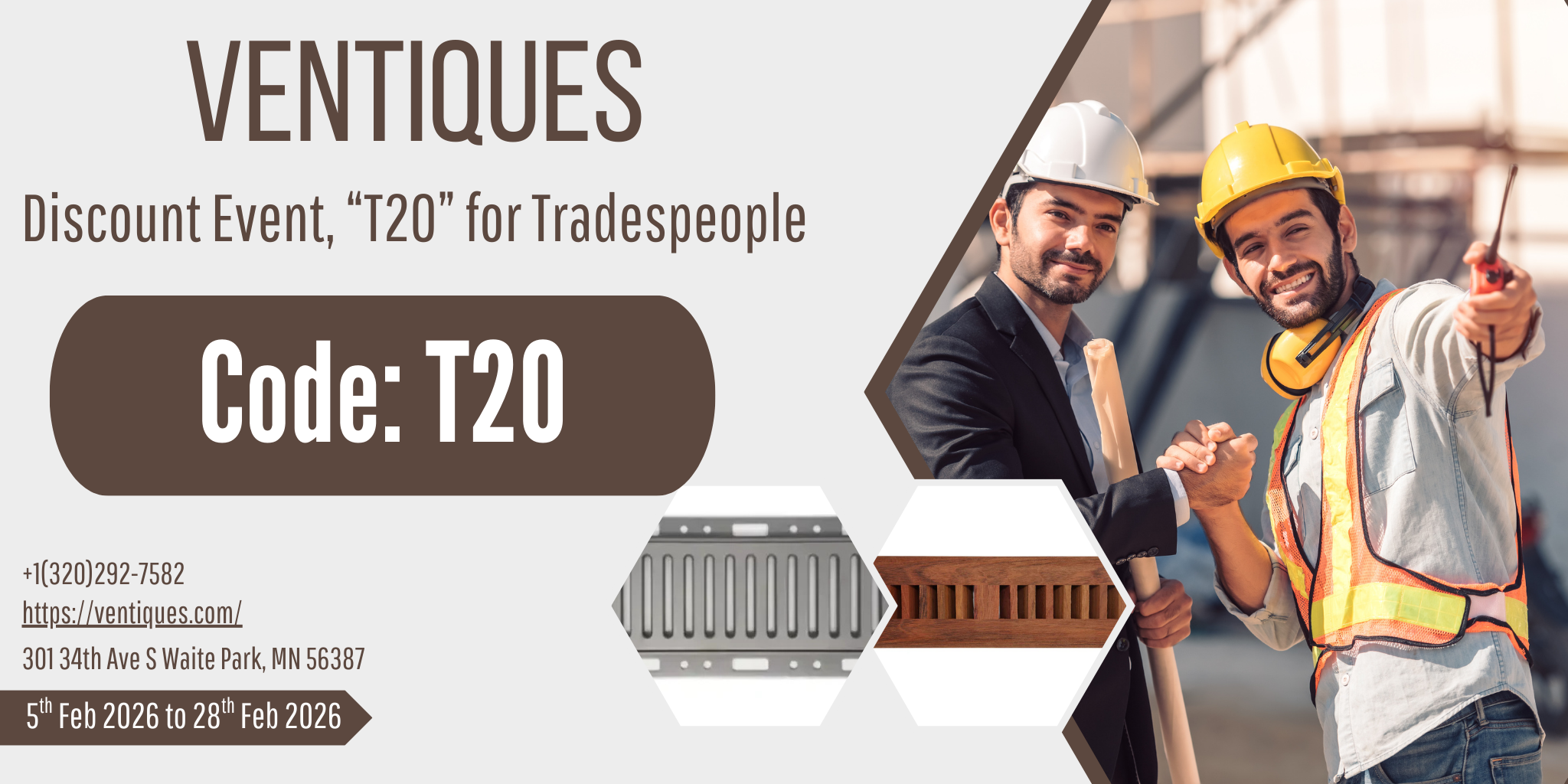 MINNESOTA, MN, UNITED STATES, January 30, 2026 /EINPresswire.com/ -- Ventiques is launching an incredible sitewide discount event, “T20” for Tradespeople (5th Feb 2026 to 28th Feb 2026).The promo code T20 will provides a 20% sitewide discount with no minimum order value, applicable to eligible tradespeople accounts.