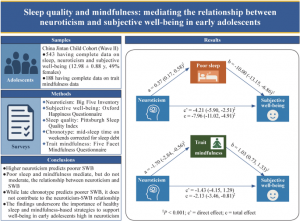 Up to 75% of adolescents experience sleep-related problems, including insufficient duration and poor sleep quality. At the same time, subjective well-being often declines during adolescence, particularly under increasing academic and social pressures. Neuroticism—marked by heightened emotional reactivity and sensitivity to stress—typically peaks during this period and has consistently been linked to lower happiness and greater psychological distress. Although sleep health, mindfulness, and personality traits have each been independently associated with well-being, limited research has explored how these factors interact during adolescence. Based on these challenges, in-depth research is needed to examine the roles of sleep quality and mindfulness in the relationship between neuroticism and adolescent subjective well-being.